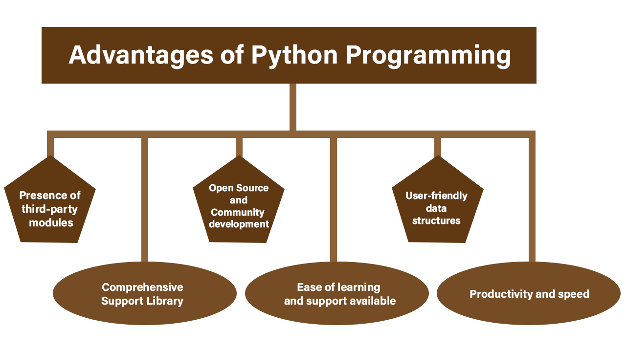 - Higher-level data structures such as lists and dictionaries are built into the language, therefore they are always available like strings or integers, enabling very efficient data manipulation.
